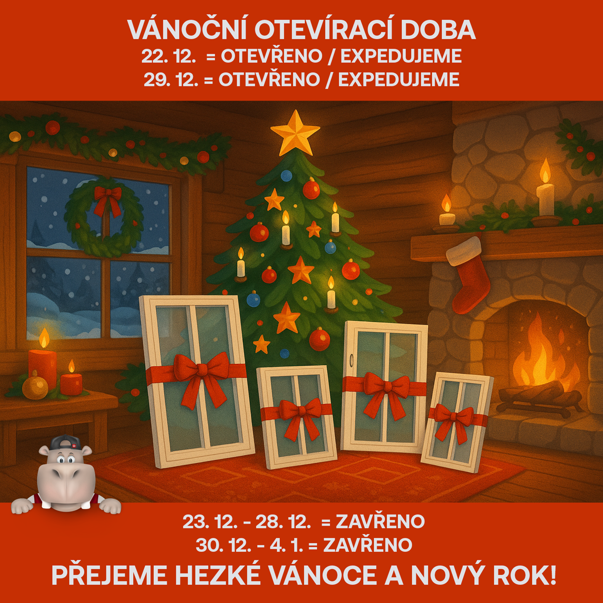 Okna jsou dodávána včetně bílé hliníkové kliky a plastových okapniček (krytky na vnější odtokové otvory).
